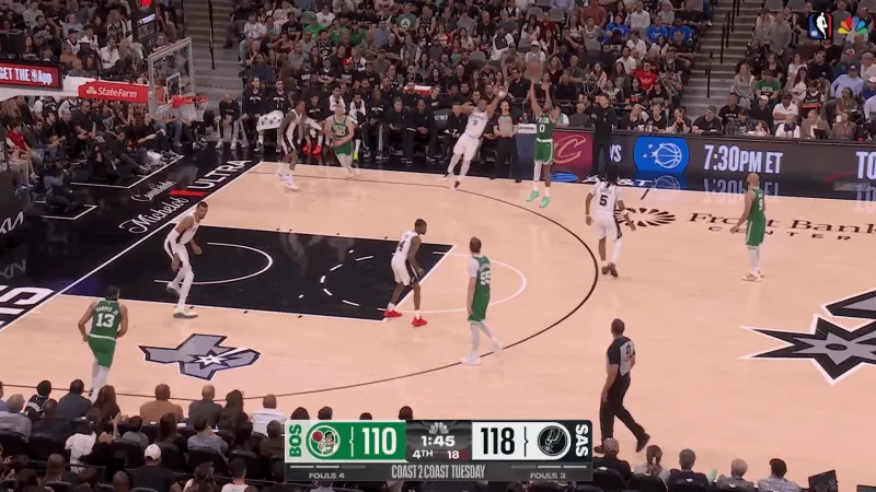 ——剩下41秒前,还是与文班亚马挡拆,强突凯尔特人三人防线,上篮打进,还造成犯规(加罚没进),这一球可以说杀死了比赛