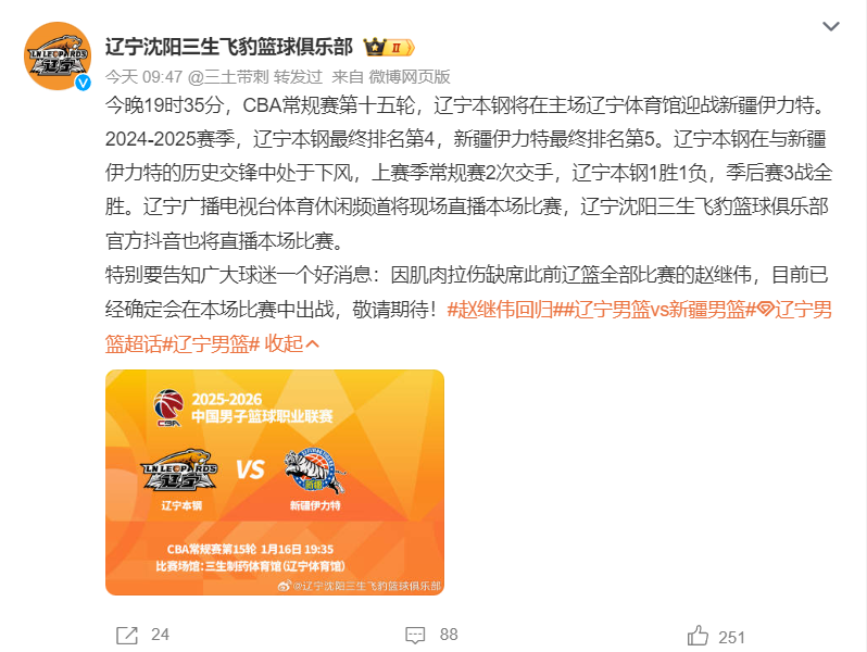 辽宁男篮官方宣布,因肌肉拉伤缺席此前辽篮全部比赛的赵继伟,目前已经确定会在本场比赛中出战。